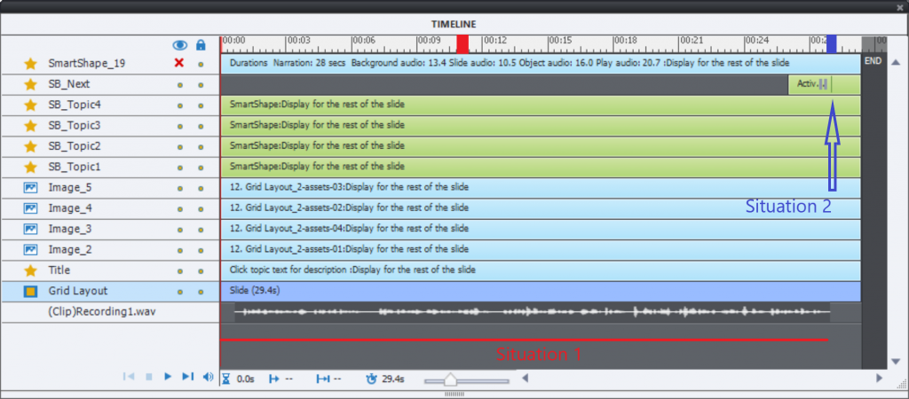 This needs apparently a conditional action for the shape buttons. You have to figure out which situation is valid. For that reason you need to know when the narration has ended. It is easy to see its duration in the timeline, in this case it was 28secs. To calculate the frame number at the end of the frame I used micro-navigation. If you are new to this type of navigation, please have a look at this blog post: