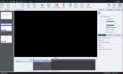 I recently installed Adobe Captivate 2019 on my MacBook Pro running macOS Big Sur. I am always getting a black screen as shown in the image. The thumbnails are fine indicating that there is content on the main screen but I am not able to see it because of the black background. Thanks for your valuable input.