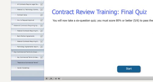 I have status flags enabled in project navigation, and everything works great until the last three slides of the course. The pages “Restrictive Commercial Terms” and “Vendor Guidelines” do not trigger the status flag after once they are played through. The status flag for “Restrictive Commercial Terms” page only appears after the learner completes the quiz (not shown in navigation). There is no difference in how these pages are configured vs. the rest of project (actions, variables, etc), so I don’t know why this is occurring or how to fix. I almost recreated the project from scratch but will lose a good day worth of work, and I need to get this project out the door. In the image below, the learner is starting the quiz, by which time each of the last two navigation tabs should include the status flag.